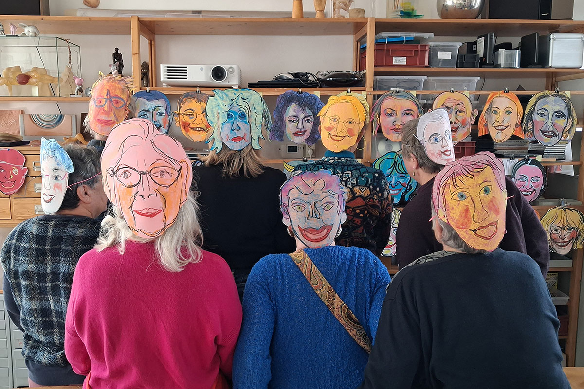 Op 5 mei is er een team van tekenaars onder leiding van Guusje Kaayk aan het werk. Het team bestaat o.a. uit cursisten van de beeldende afdeling van Zinder die onlangs bij Guusje Kaayk een workshop volgden met de naam Blije maskers/Samen Portrettekenen. Een paar reacties: “Ik kan helemaal niet tekenen, maar ik heb het nu een beetje geleerd. En waarom zou het moeten lijken? Als er maar gevoel in zit.” Een andere cursist: “Iedereen is een beetje droevig door alle toestanden in de wereld. Daarom draag ik nu een vrolijk masker.” Twee vriendinnen tekenden elkaar. Tot grote hilariteit: “En nu maar hopen dat de maskers de stad in gaan. Dan zie je allemaal mensen met een vrolijk masker.”