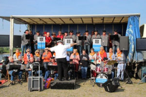 Op diverse plekken langs de route aan beide kanten van de Waal stonden fanfares, koren en zangers opgesteld.
